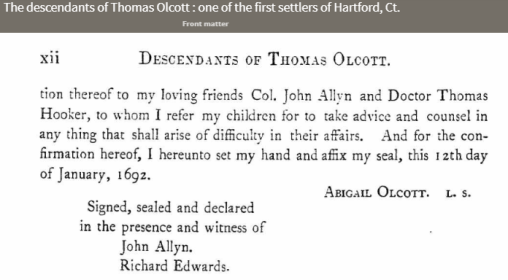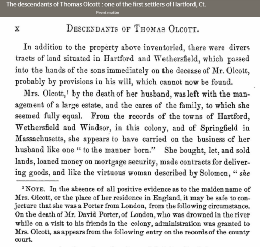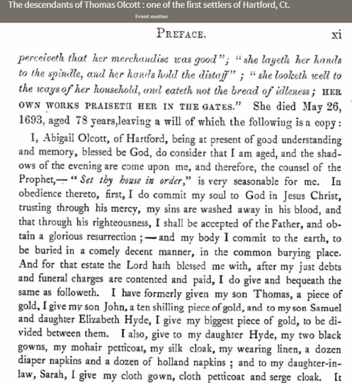 It is this Abigail Porter who wrote her last will and testament and gave a clear testimony of her Salvation. She was the wife of Thomas Olcott II, who was one of the first settlers of Hartford, Connecticut. She is buried in Hartford, Connecticut. See: